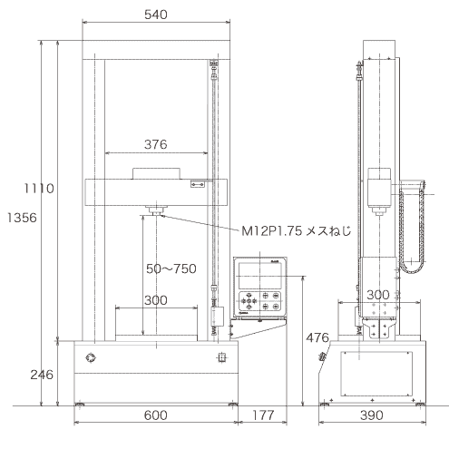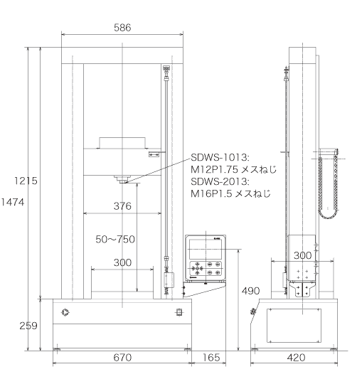 ■標(biāo)準(zhǔn)規(guī)格| 型號(hào) * 1 | SDWS-0213-□ | SDWS-0513-□ | SDWS-1013-□ | SDWS-2013-□ | | 最大負(fù)荷 | 2kN | 5kN | 10kN | 20kN | | 負(fù)荷顯示 | 請參閱“負(fù)載范圍規(guī)格”表請參閱 “按型號(hào)劃分的負(fù)載范圍組合表” | | 最小單位 | | 負(fù)載精度 | JIS 1級試驗(yàn)機(jī)(測量指令值的±1%以內(nèi)) | | 最小排量單位 | 0.01毫米 | | 驅(qū)動(dòng)系統(tǒng) | 交流伺服電機(jī) | | 速度范圍 | 0.1-500mm /分鐘 | 0.05-100mm /分鐘 | | 工作臺(tái)到稱重傳感器的距離 | 最大750mm(有效行程取決于夾具的選擇) | | 有效測試寬度 | 376毫米 | | 工作臺(tái)尺寸 | 300 x 300 mm帶T形凹槽 | | 安全設(shè)備 | 任意設(shè)定上下限開關(guān),過載自動(dòng)停止 | | 有用的功能 | 測試條件內(nèi)部存儲(chǔ)器保持功能 峰值/谷值保持功能 循環(huán)操作功能 斷點(diǎn)檢測功能 起點(diǎn)檢測功能 自動(dòng)取消/自動(dòng)進(jìn)給功能 自動(dòng)原點(diǎn)返回功能 結(jié)果通過/失敗判斷功能 | | 外部輸出* 2 | USB | | 電源供應(yīng) | AC100V 10A | | 體重 | 約130kg | 約180kg | | 外形尺寸 | 寬770 x深390 x高356毫米(圖紙顯示) | W835×D420×H1474mm(圖紙顯示) | * 1在□欄中輸入載荷符號(hào)模型。請參照“各型號(hào)的負(fù)荷范圍組合表”。 * 2可以添加用于模擬或打印機(jī)的可選外部輸出。