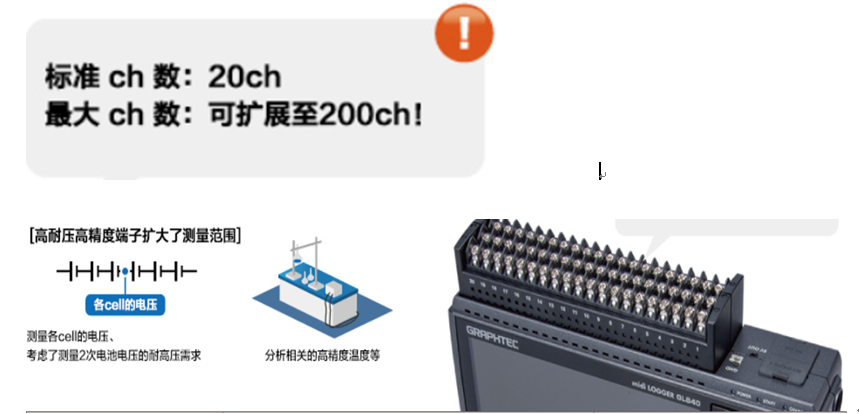 midi LOGGER GL84-0WV C存儲記錄錄儀是一款耐高電壓型記錄儀適用于積層電池包的電壓測定和高精度的溫度測定。標(biāo)配20個通道,最大可以展到200道,可以同時采樣電流,溫度,濕度,脈沖,邏輯,壓力等物理信號。標(biāo)配8G的內(nèi)置,8的內(nèi)置Flash閃存。機(jī)器外接SD卡最大還可以32G存儲空間。采用7寸液晶大屏幕顯示、可以直接在屏幕上顯示實時數(shù)據(jù)變化曲線和數(shù)據(jù)列表。記錄數(shù)據(jù)可保存為GBD(graphtec binary data)格式、CSV格式。GBD格式需要用儀器專用軟件進(jìn)行查看,CSV格式可以直接用EXCEL打開。