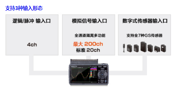 | 支持3種輸入形態(tài)  配備了[模擬信號輸入(全通道隔離多功能)][邏輯/脈沖輸入][數(shù)字式傳感器輸入口]的3種輸入口、可測量各種各樣的現(xiàn)象。